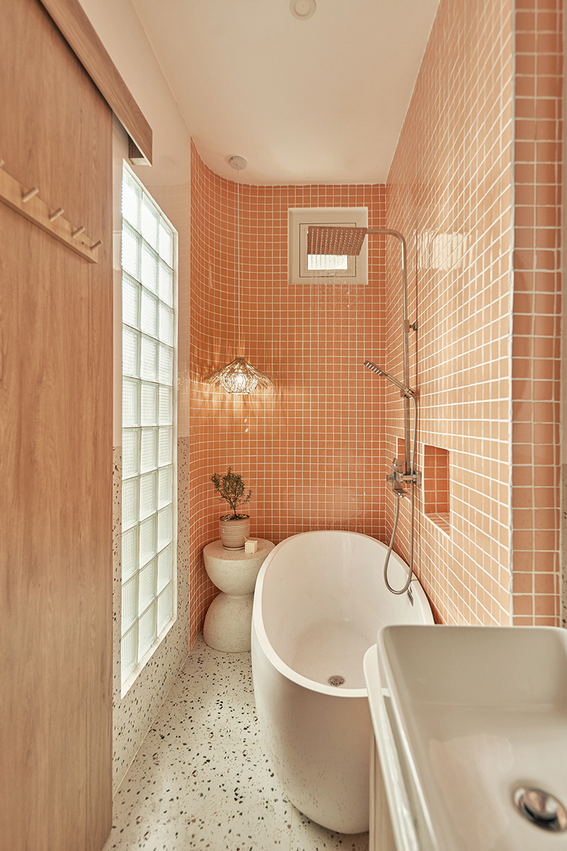 Tường nhà vệ sinh được bo cong mềm mại làm cho không gian có sự luân chuyển nhịp nhàng, khắc phục điểm yếu diện tích hẹp của công trình.