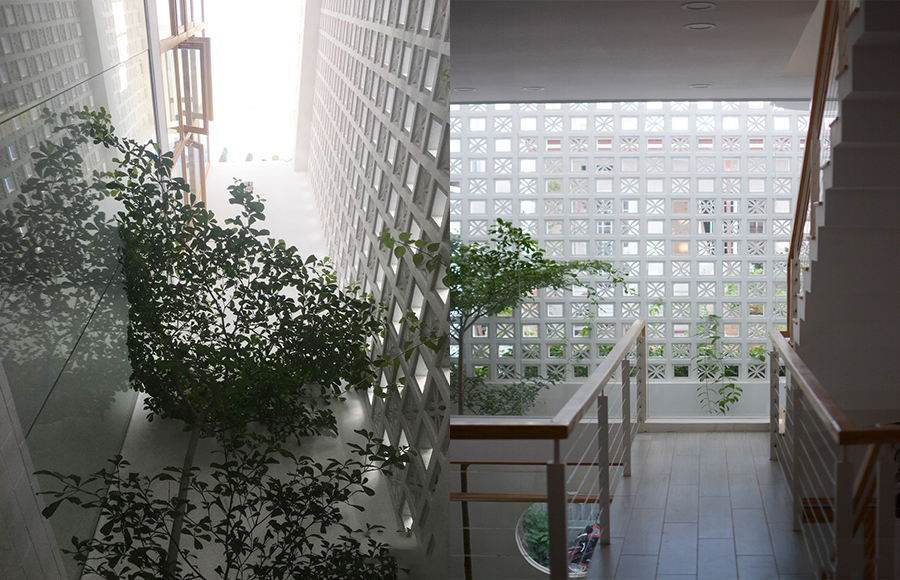 Giải pháp mà các KTS đưa ra chính là nhường một phần diện tích phía trước để trồng cây xanh sau lớp vật liệu hoa gió và thiết kế giếng trời nhỏ phía sau để đảm bảo sự tiện dụng cho cuộc sống sinh hoạt hàng ngày.
