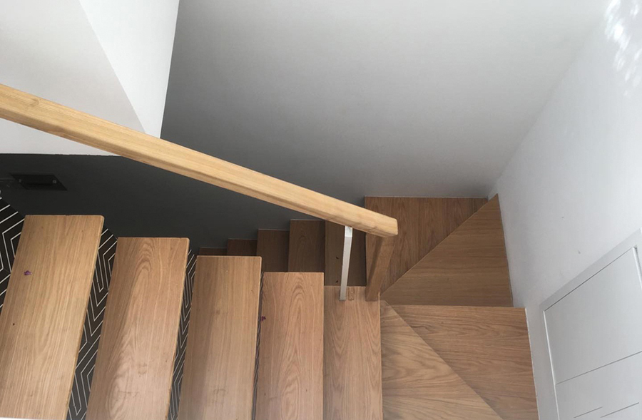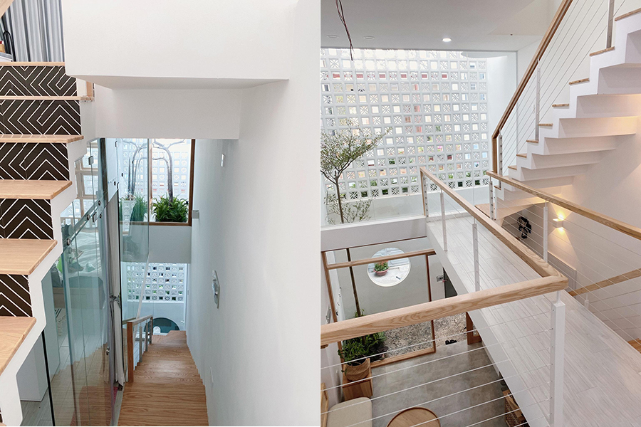 Khu vực cầu thang được bố trí một vế thay đổi liên tục, bên cạnh đó là khoảng thông tầng ở khu vực tầng lửng giúp không gian sống như nằm ở trong lòng thiên nhiên.