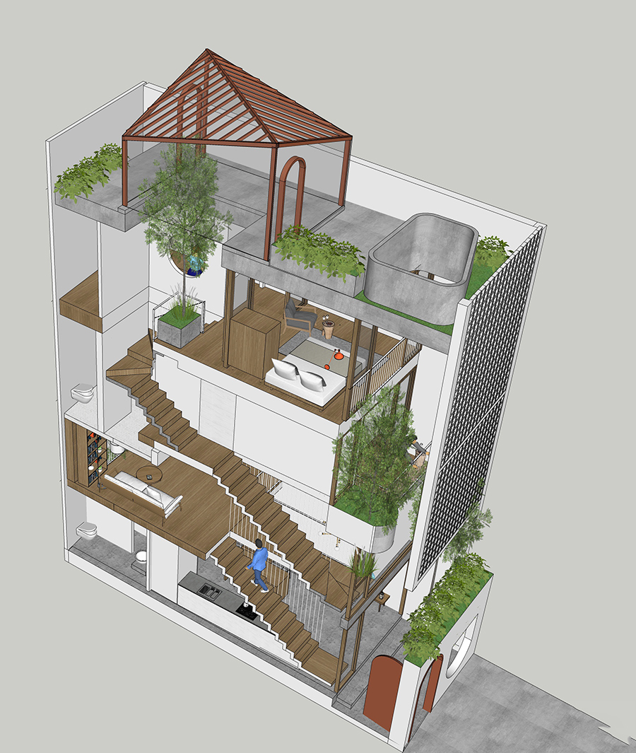 Một lát cắt để thấy được các khoảng thông tầng tạo sự thoải mái, dễ chịu cho mọi người sống trong nhà.