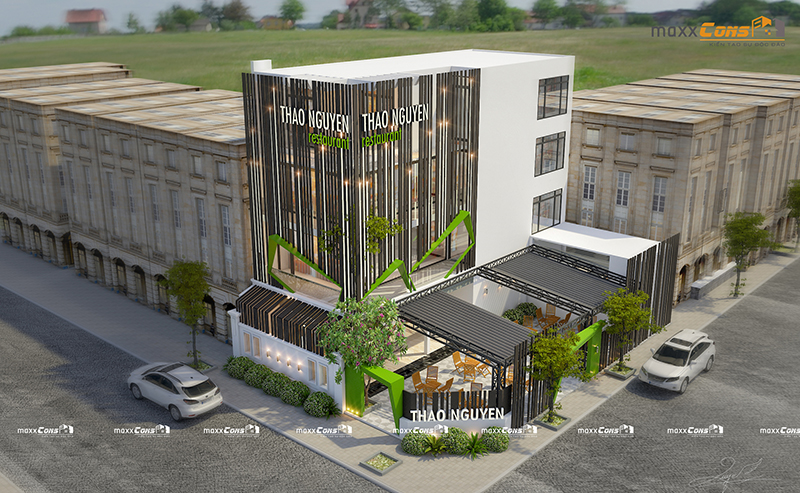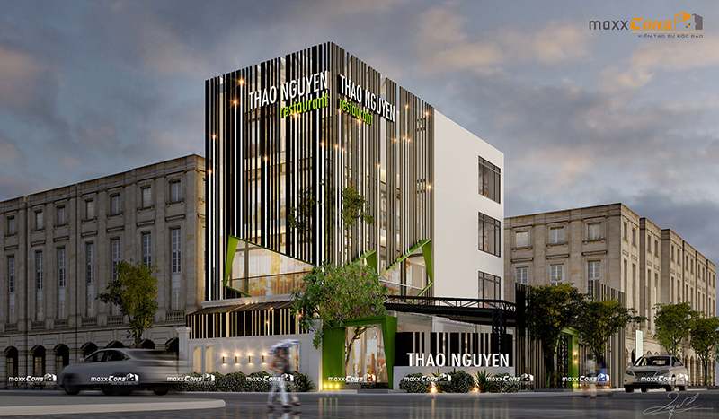 maxxCons mời quý khách và độc giả cùng tham khảo mẫu thiết kế nhà hàng đẹp Thảo Nguyên tại Hải Phòng với thiết kế tinh tế chi tiết và vô cùng độc đáo. Mẫu thiết kế nhà hàng hiện đại đẹp cực kỳ sang trọng đầy lôi cuốn rất nhiều người nếu là khách khi đi qua thì sẽ dừng lại vài bước ngắm nhìn ngôi nhà hàng trước khi vào thử món ăn, mẫu thiết kế nhà hàng này do kiến trúc sư maxxCons thiết kế mang một nét kiến trúc đẹp độc đáo nhất, đây là mẫu nhà hàng 5 tầng được xây dựng trên diện tích lớn tại một khu phố đông đúc tại Hải Phòng.
