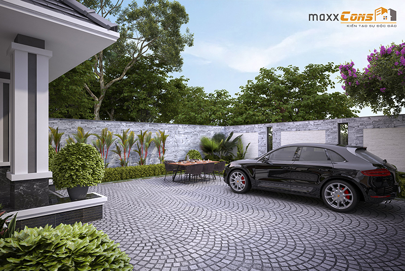Khoảng sân được ốp gạch màu ghi xám xanh, là một trong những mẫu gạch thường sử dụng trong sân vườn nhà phố. Từ đó, giúp không gian có sức sống, thiết kế hài hòa hơn với cảnh quan thiên nhiên.