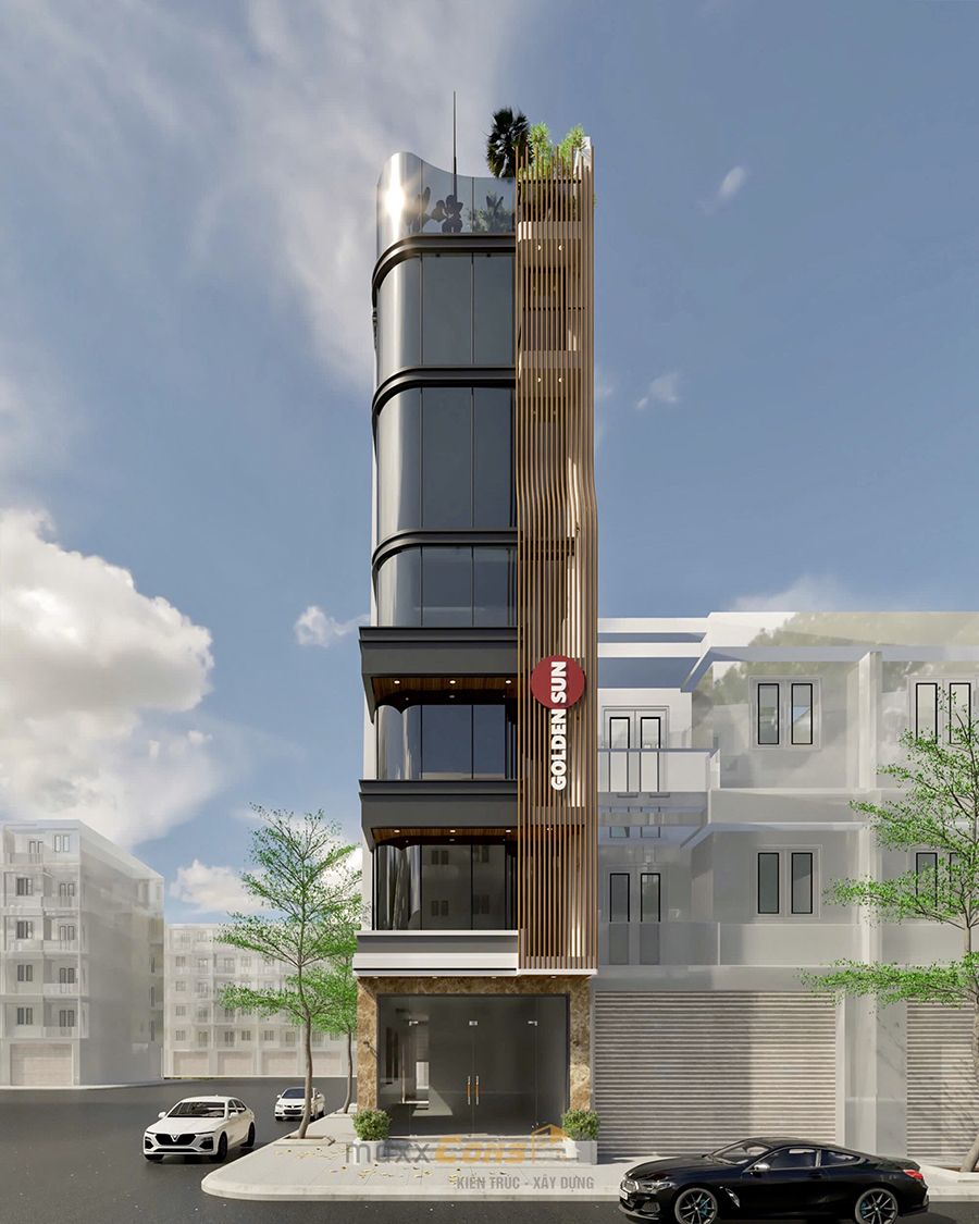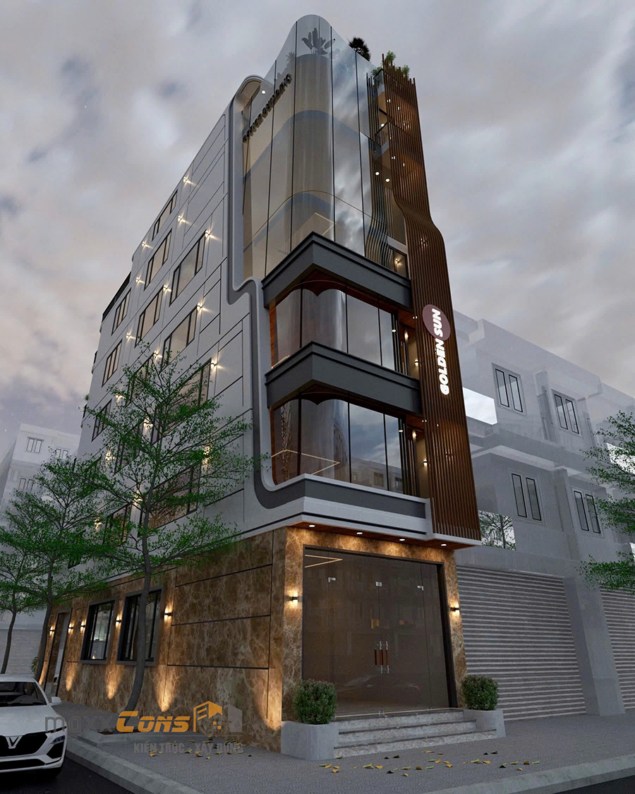 Mặt tiền toà nhà là sự giao thoa giữa các đường cong mềm mài và những góc nhọn hiện đại, tạo nên sự cân bằng thị giác và độc đáo cho tổng thể kiến trúc. Việc sử dụng các chất liệu cao cấp như kính cường lực kết hợp với các chi tiết đồng đã tăng thêm phần tinh tế và sang trọng cho toà nhà.