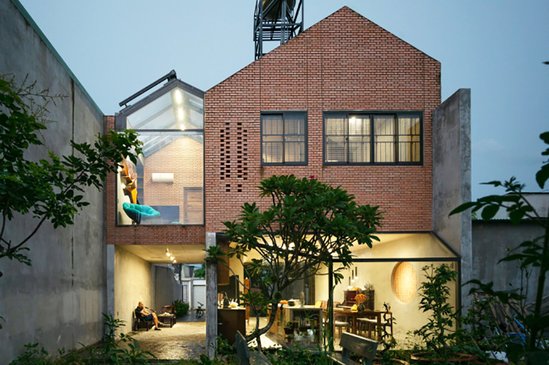 Mặt tiền của một ngôi nhà được trang trí gạch trần.