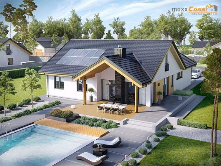 Nhà cấp 4 mái thái được thiết kế chủ yếu ở mảnh đất diện tích rộng thoáng kết hợp làm sân vườn và bể bơi